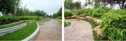 據高經理介紹,該工程是壽光市2009年的一項重點市政工程,本著綠色、生態、自然的原則,在保留部分大樹的基礎上,對道路景觀進行了全新改造。工程由北至南,依次設置下沉廣場、北廣場、南廣場、方形廣場等多個景觀節點,每個節點的植物配置、地面鋪裝等都各不相同,形成一個個獨具特色的小場景;同時,又通過錯落有致的植物搭配、蜿蜒曲折的游憩步道,將整個工程貫穿起來,使得整體的景觀效果統一中富于變化,開闊中層次分明。