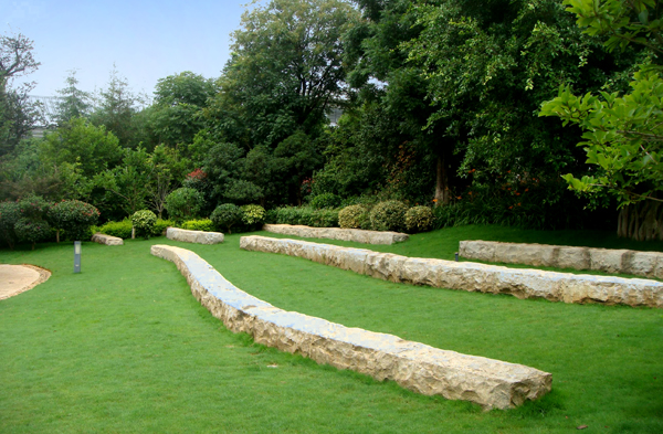 自然面花崗巖條石布置在草坪上,營造極具現代氣息的景致。