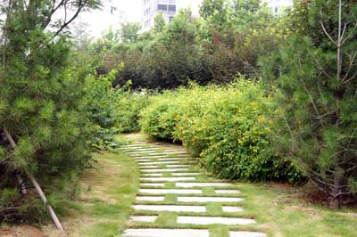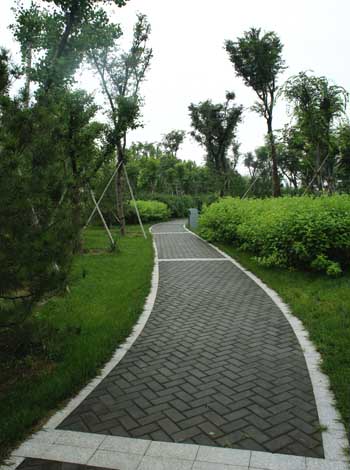 而在道路十字路口的節點處,則主要是用10cm×10cm的小花崗巖鋪地,鋪出來的路面整潔、平坦,看似簡單,實則對施工技術要求相當高。草坪中的地面鋪裝,則采用花崗巖汀步,用錯縫鋪裝法,兩塊花崗巖之間用草皮鑲嵌,就像給每塊花崗巖鑲了一道綠邊,與旁邊的草坪和諧地融為一體。貫穿整個工程的游憩步道,全部采用“人字形”的鋪裝方法,中間用透水磚、兩邊以花崗巖鑲邊,透水磚價格不高,用以鑲邊的花崗巖是利用了鋪裝中剩余的邊料,雖然用料簡單,但通過對技術的嚴格要求,鋪出的路面卻整潔而不失韻味,是一種實用、環保、節約的做法。