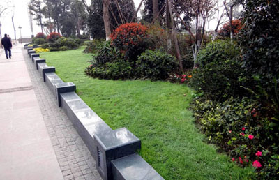 據(jù)李壽仁介紹,保留下來(lái)的大樹(shù)主要有兩種處理手法:像天竺桂、黃葛樹(shù)等幾十年的老樹(shù),在周?chē)罱举|(zhì)平臺(tái),既可以保護(hù)大樹(shù),又可供游人休息;一些香樟、桂花、銀杏等,則用森林綠整石圍邊,搭配草皮、三色堇、球類(lèi)、日本紅楓等植物,采用花境的布置手法,建成一個(gè)個(gè)面積大小不一的花壇,營(yíng)造出四時(shí)風(fēng)光各不同的江南園林意境。而平滑、細(xì)膩的森林綠整石,既是景觀的一部分,又是漂亮的坐凳,兼顧了景觀與實(shí)用的功能。