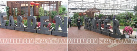 一進入室內,首先映入眼簾的就是“GARDEN CENTER”(花園中心)幾個大字,仔細一看,上面還有流水青煙,十分吸引人的眼球。花園中心內不僅展示了各式各樣的室內植物、庭院植物,更有各種肥料、工具等園林資材展示。