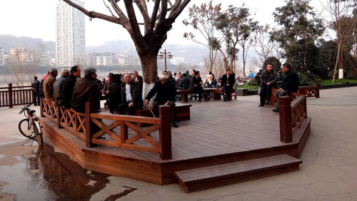 “我們將館驛嘴廣場的設(shè)計基調(diào)定位為‘奢華’, 是指使用的材料要‘真材實料’,施工工藝要經(jīng)得起考驗。”李壽仁邊走邊介紹說,“漣漪廣場上的冰裂紋圖案鋪裝,采用兩種顏色的花崗巖,為了營造出氣泡的效果,特意將圓形的花崗巖用不繡鋼鑲邊,加深色彩,形成對比,從而營造出‘激起漣漪無數(shù)’的奧妙,實現(xiàn)館驛嘴這艘航船動起來的效果,為了保證施工質(zhì)量,工人都是從杭州請來的專業(yè)人員;所有的青石鋪裝,全部采用人工石刻,我們現(xiàn)在看到的這些菠蘿面、荔枝面等紋路,是幾百名能工巧匠一鑿一鑿刻出來的,這種自然、厚重、原生態(tài)的質(zhì)樸美,是機器切割無法實現(xiàn)的,更重要的是,大量青石的運用,可以有效抵抗洪水的沖刷,就算50年一遇的洪水來襲也不怕;反映瀘州民俗生活的三缺一麻將雕塑,則是用全銅制作,人物形態(tài)惟妙惟肖,紋路雕刻精致細(xì)膩,彰顯出工藝的用心和考究;亭、廊等木結(jié)構(gòu)建筑則采用實木制作,對木質(zhì)材料和厚度都有嚴(yán)格的要求,達(dá)到美觀與實用兼顧的要求。”
