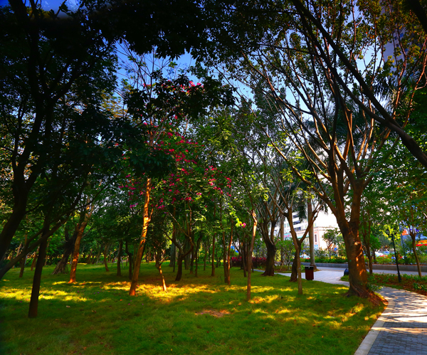 路旁綠地保留了2800多株冠幅茂密的原有喬木,根據(jù)地形又增加了不同規(guī)格的小葉榕、藍(lán)花楹、鳳凰木、宮粉紫荊、雞蛋花等喬木,小葉紫薇、丹桂、四季桂、大紅花等灌木,以及勒杜鵑、三色堇、紅車(chē)、巴西鳶尾、花葉良姜、巴西野牡丹等地被和草花植物,形成豐富的植物群落。臨近道路的邊緣則片植紅花夾竹桃、紅花羊蹄甲等做背景,下層列植尖葉木犀欖等常綠灌木,形成繁花似錦的熱鬧景觀。