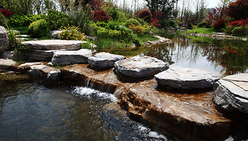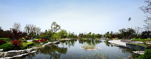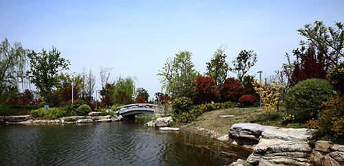 其中,人工湖面積7000平方米,小而精致,可謂是整個公園的“點睛之筆”。由親水平臺區,源頭區,中心湖面區,鄰水生態區,橋梁區構成。湖面區域貫穿整個工程,沒有自然條件的襯托,完全由人工園林造景手法完成,在鄰水景觀帶種植睡蓮、荷花、再力花、千屈菜、鳶尾、蘆葦等水生植物,營造生態岸線,同時選擇其他親水植物,如美人蕉、碧桃、楊柳、水杉作為過渡和背景,虛實結合,營造出多方位的景觀效果。湖面雖小,但結構完整,假山疊水,拱橋,原石臨水橋,湖邊卵石生態群落一應俱全。其中,景石主要使用了安徽的靈璧景石,約7000噸,堆疊出水源、暗橋、親水沿岸等景觀。