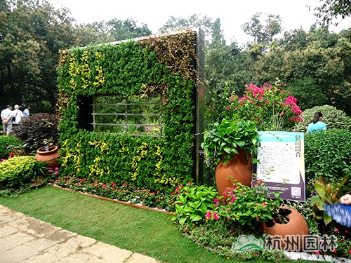 走進畫境園,只見主入口左側種植著兩株一高一矮的厚皮香樹,郭昌如笑著說,“這兩棵厚皮香寓意的是兩個萬分自豪的森林衛士——熊大和熊二,你看,熊二還滿臉熱情地向游人不停地招手示意呢。”主入口右側是一面立體綠植墻,所用的植物主要為黃金絡石、金寶石冬青、小葉梔子花、金邊黃楊等。“立體綠植墻是立體綠化的主要形式,畫境?青山湖花園中心推出的這款立體綠植墻產品,可以根據客戶需要,結合氣候、溫度、濕度、色彩等綜合條件,選配四季長綠或色彩豐富的植物,隨時在人們想要的地方構建出一個貼近自然又超脫自然的生活環境,可謂是簡單又方便。”郭昌如介紹道。立體綠墻的兩側,隨意地散落著一些紅陶罐,與金寶石冬青、龜甲冬青等精品球形植物,三角梅、月季、常春花、雞冠花等花卉,紫葉狼尾草、晨光芒、矮蒲葦等觀賞草混搭,營造出一種溫暖、和煦的庭院景觀。“如果把綠植墻看成是城市的建筑,此景則喻意美麗杭城的繁華一角。”郭昌如補充說。綠植墻的中間還別出心裁地設置了一扇窗戶,透過它,園內的美景已隱約可見。
